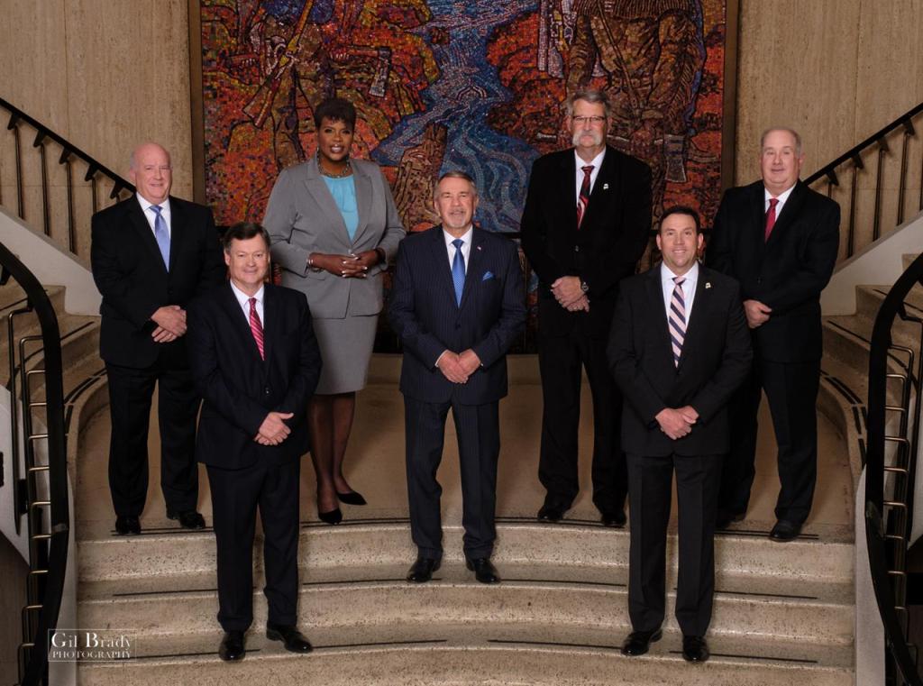 Pictured from left to right: Commissioner Phil Riddick, District 5; Commissioner Steve Haraway, District 2; Commissioner Violet Edwards, District 6; Chairman Mac McCutcheon; Commissioner Tom Brandon, District 1; Commissioner Craig Hill, District 3; Commissioner Phil Vandiver, District 4
